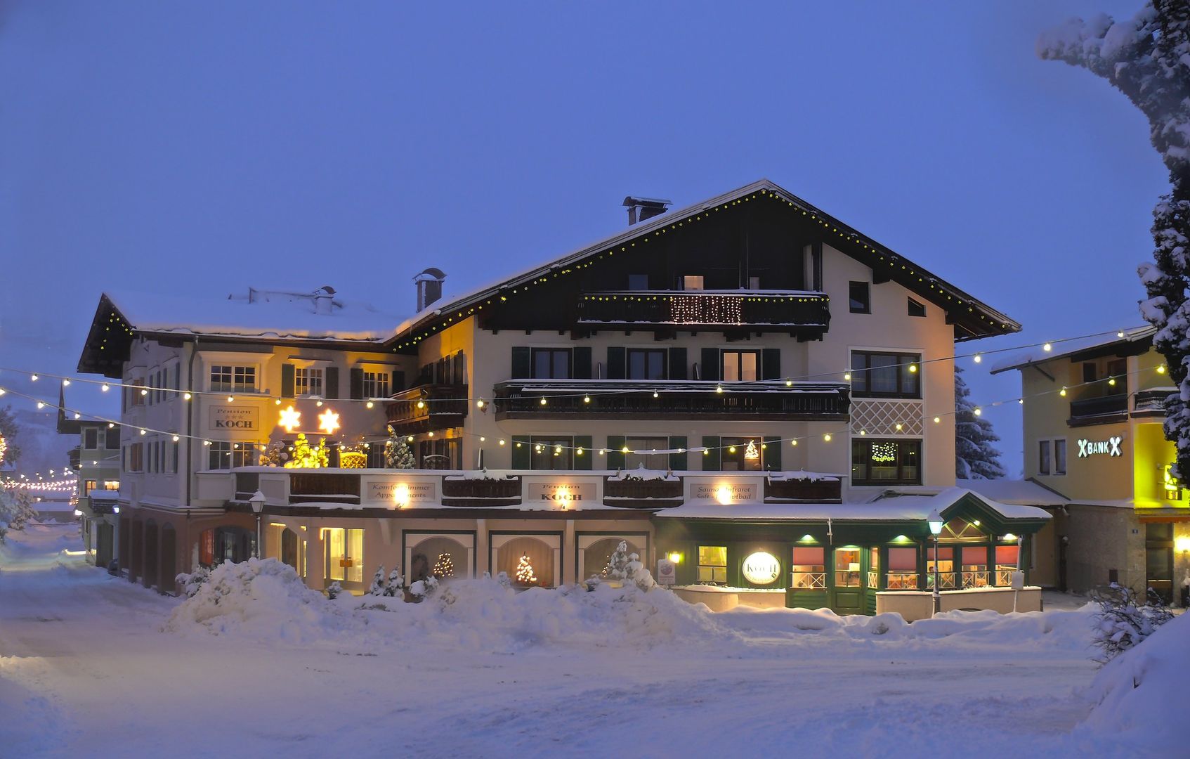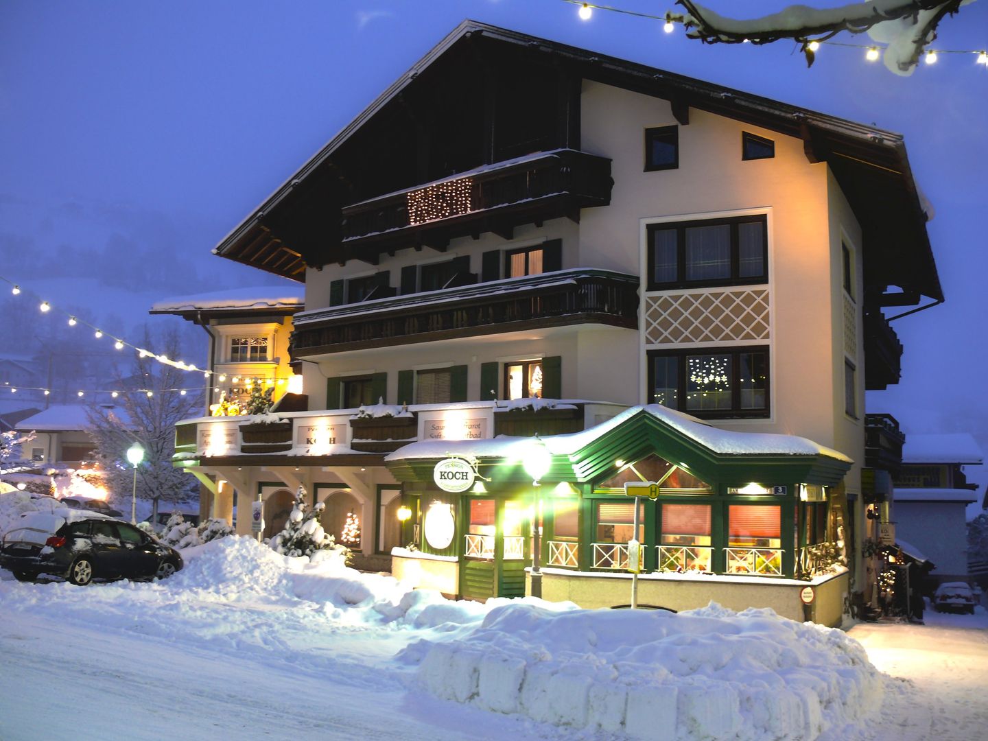 Poloha Rodinný 3hvězdičkový penzion Koch leží přímo v centru obce Uttendorf. Do nejbližšího lyžařského střediska Vás vyveze lanovka "Enzingerboden", která se nachází cca 17,5 km od ubytování. Běžkařské trasy jsou vzdálené asi 450 m. Spoustu zábavy si užijete i na sáňkařské dráze, ke které dorazíte asi po 14 km. K nádraží Uttendorf Stubachtal je to asi 450 m. K obchodům dorazíte přibližně po cca 80 m. Vybavení K vybavení příjemně zařízeného penzionu patří recepce, Wi-Fi, knihovna, společenská místnost, snídaňový salonek, hotelová restaurace, hotelový bar a vinný sklípek. Své zimní sportovní vybavení si můžete po dobu pobytu odložit ve sklepní lyžárně. Hosté mají podle dostupnosti k dispozici parkovací místa. Wellness Hosté si mohou odpočinout a relaxovat ve wellness prostorách. Najdete zde finskou saunu, parní lázeň, infračervenou kabinu a zážitkovou sprchu. Odpočinout si můžete také v relaxační místnosti. Masáže jsou dostupné za poplatek. Děti Dětská herna nabízí malým hostům zábavu přiměřenou jejich věku. Za poplatek si je možné vypůjčit dětské postýlky, dětské židle jsou zahrnuty v ceně (na vyžádání/dle dostupnosti). Stravování Stravování zahrnuje (při objednávce ubytování s polopenzí) drink na uvítanou a vydatnou snídani ve formě bufetu s regionálními produkty, jogurtem, uzeninami, sýrem, vejci, různými druhy čaje a čerstvě vymačkanými ovocnými šťávami. Večer dostanete 4chodové volitelné menu s 2 různými variantami hlavního jídla i s předkrmem, salátem a dezertem. Na Vánoce se koná vánoční galavečer, na Silvestra se koná silvestrovské gala. Na přání je možné připravit vegetariánskou i dietní stravu. Veganská, bezlepková stejně jako bezlaktózová strava je za poplatek.